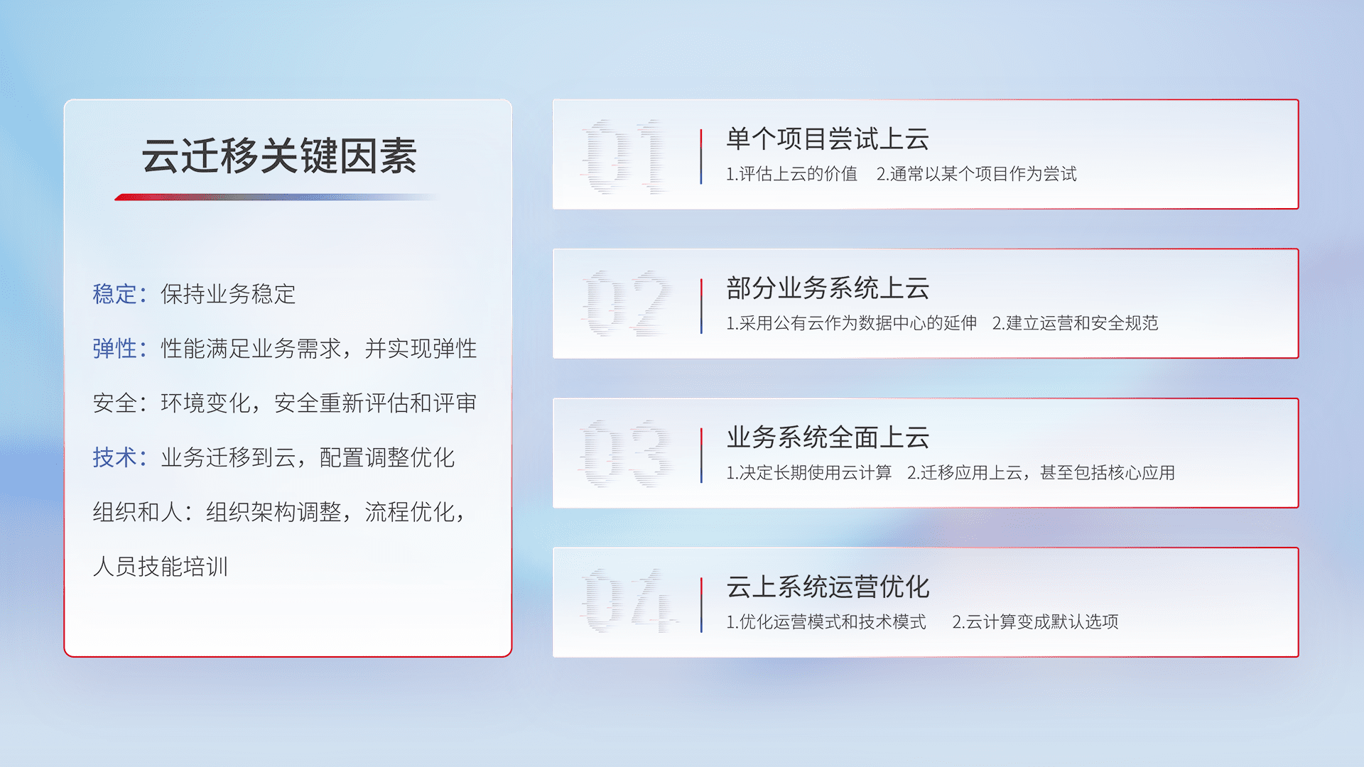 结合实际业务,,,从规划设计、、、云平台选型、、、云原生改造、、数据迁移、、、、集成交付,,迁移全过程为客户识别最佳上云路径,,做好风险识别管理,,,,设计网络架构、、、身份权限、、、、安全审计合规、、、、操作审计、、日志审计、、监控告警策略、、、多站点容灾设计等,,,对云上基础设施进行整体规划,,,提升IT治理水平,,,以满足弹性、、、高可用、、、、高性能的需求。。。。